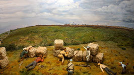 The siege ended on the third day in a dramatic and unusual way. The Southerners had discovered a quantity of hemp bales in a nearby warehouse and arranged these bales in a line on the west side of the Union entrenchments. They then began rolling the bales ever closer to the line of trenches. The panicked Federals unleashed their artillery into the moving breastwork, but their cannon balls had little effect on the dense bales. By early afternoon, the snakelike line of bales had advanced close enough to the Union trenches for a charge, and the defenders of that sector engaged in a brief but bloody hand-to-hand fight before being driven back into their entrenchments. By now, Mulligan and most of his officers were wounded and he realized that the time for surrender had come.
