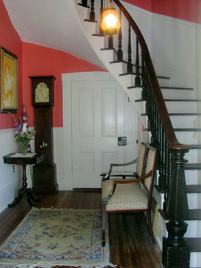 Don’t miss the Missouri River Scenic overlook provided by the Lafayette County War Memorial. The story and a half home on the corner was built around 1840. Owner James Lightner was wounded in 1861 when trying to free Southern sympathizers from the steamboat White Cloud, then killed trying to escape. The right side of the duplex across the street was built around 1842, and later used as a bank. This is one of the earliest duplexes built west of the Mississippi. There are several Greek Revival homes along Highland that were built around 1840. Quarters for household slaves remain in the rear of a few. The clapboard Greek Revival was owned by Pony Express founder William B. Waddell before he moved to a grander house on South St.