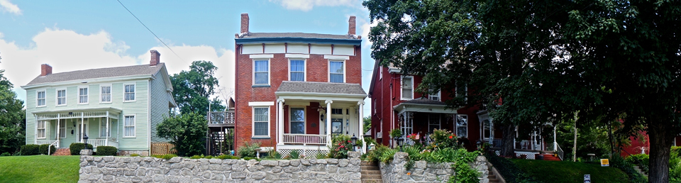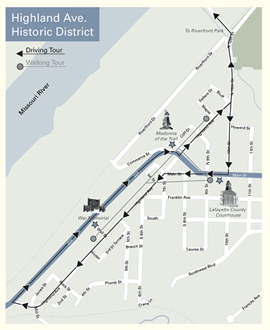 This scenic street was a branch of the Santa Fe Trail, leading west and runs along the bluff above the Missouri River. It intersects with the road that led to the ferry and Upper Landing in the steamboat era. Highland also led to the Lower Landing’s warehouses, hotels & ropewalks, where hemp was twisted into rope. According to a newspaper of the period, the Lexington Intelligencer, “It was no unusual thing to see six or eight steamboats at our landing . . . a line of wagons a half mile long waited for their time to move forward down Broadway to the warehouses.” Prominent merchants built homes along Highland in the 1840s and ’50s. Later, coal miners lived on “Irish Town Hill.” The Aull family built or owned many of the homes, including the Elizabeth Aull Seminary.